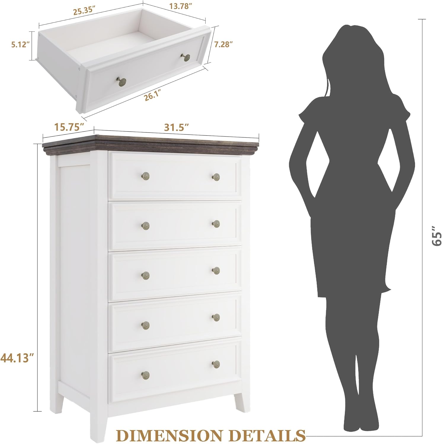 - Modern Farmhouse Style: The modern 5 drawer dresser is clean White finish with vintage-style metal knobs and crisp vertical/horizontal lines creates a minimalist look. Seamlessly complements modern, industrial, or traditional decor schemes.