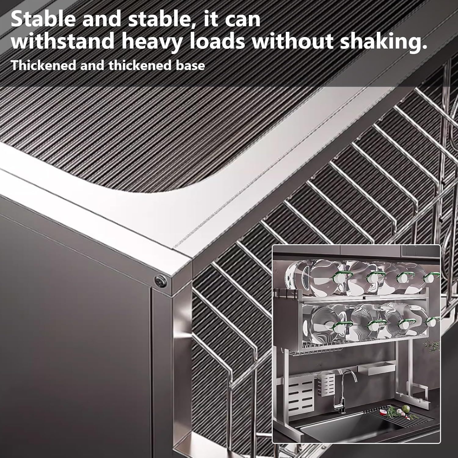 - Double-Layer Design for Space Saving:Its innovative double-layer design frees up to 80% of countertop space, efficiently organizing your kitchen. The stainless steel over-the-sink dish drying rack can hold plates, bowls, pots, and even plants, with water draining directly into the sink for efficient drying and tidy storage.