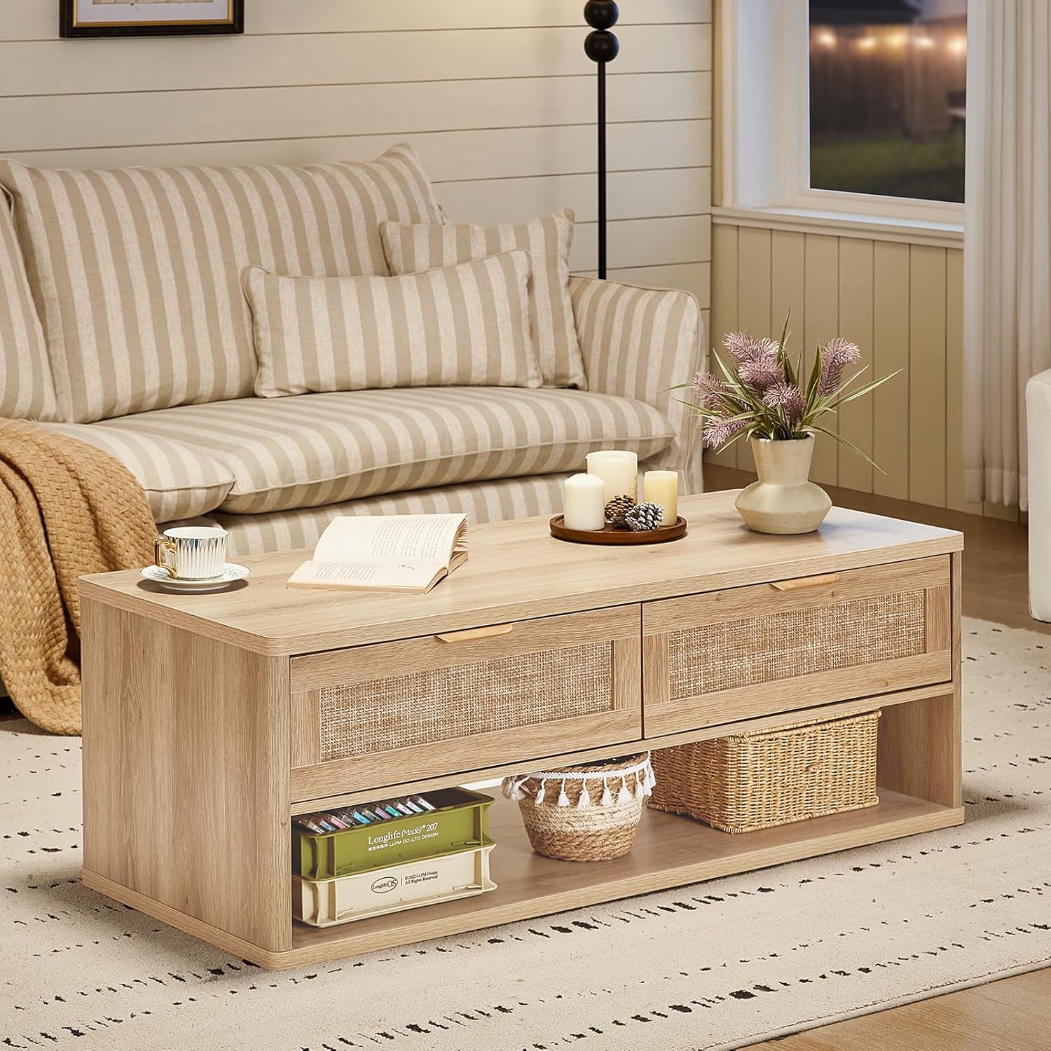 - Bohemian Rattan Coffee Table:Designed to complement the LEYAOYAO furniture collection, this bohemian-style center table for living rooms features an aged wood-grain finish and woven rattan panels. High-quality metal knobs and drawer runners contribute a modern or farmhouse aesthetic.