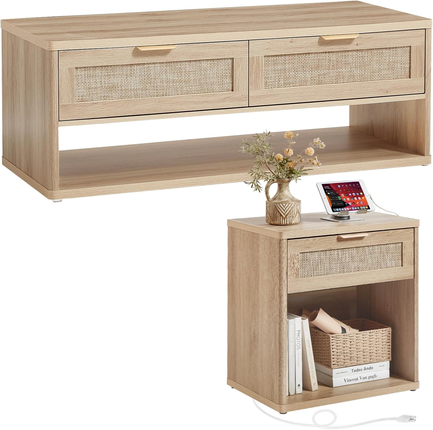 LEYAOYAO Boho Rattan Coffee Table Sets 2 Pieces, Nightstand with Charging Station and Coffee Table with Hidden Storage Compartment, Natural Living Room Table Set, Wood Furniture Sets for Home Office