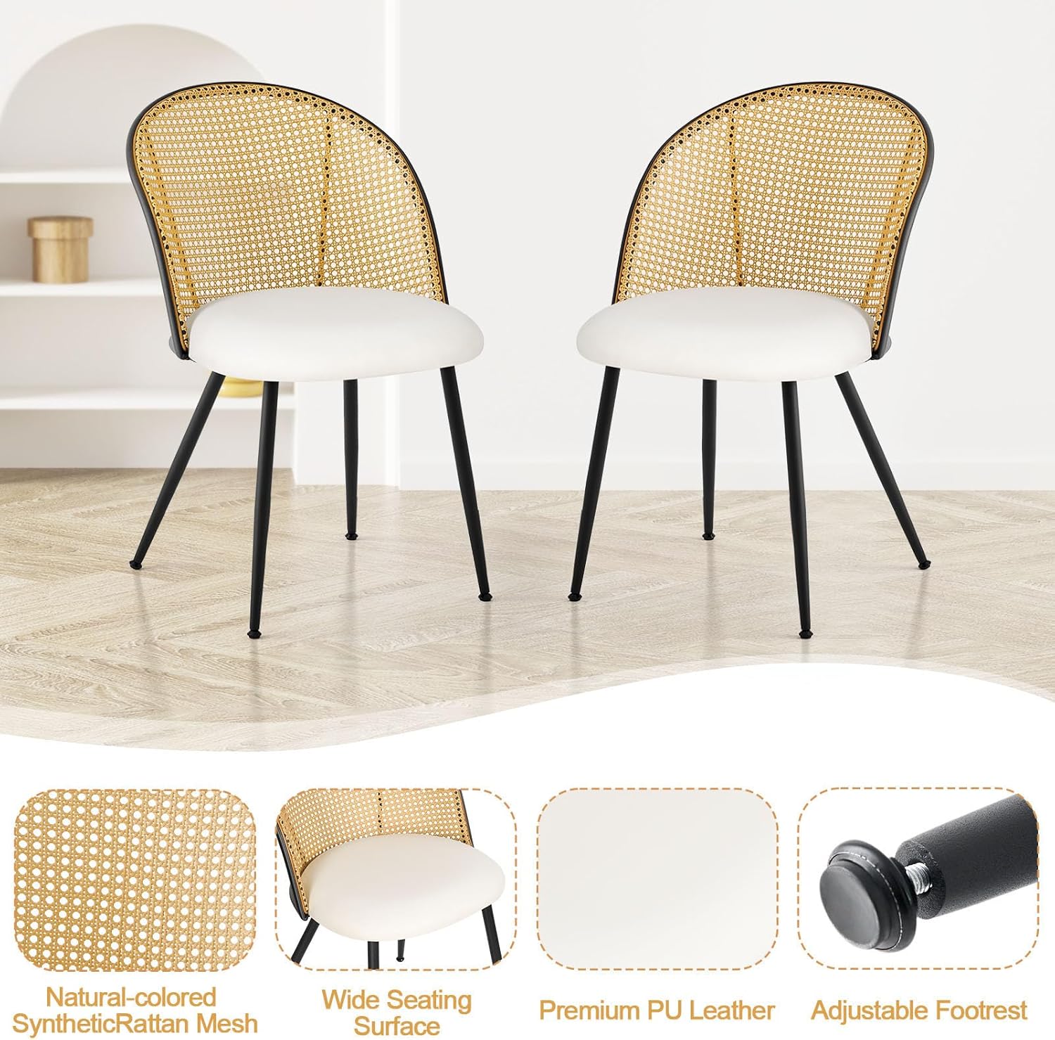 - 【Modern Mid-Century Style】: These dining chairs boast the sleek and timeless design of mid-century aesthetics. Powered-coated black metal legs provide a touch of contemporary elegance, while the exquisitely crafted rattan hollow back provides a delicate accent of natural beauty. This design evokes classic charm and creates an idyllic atmosphere.
