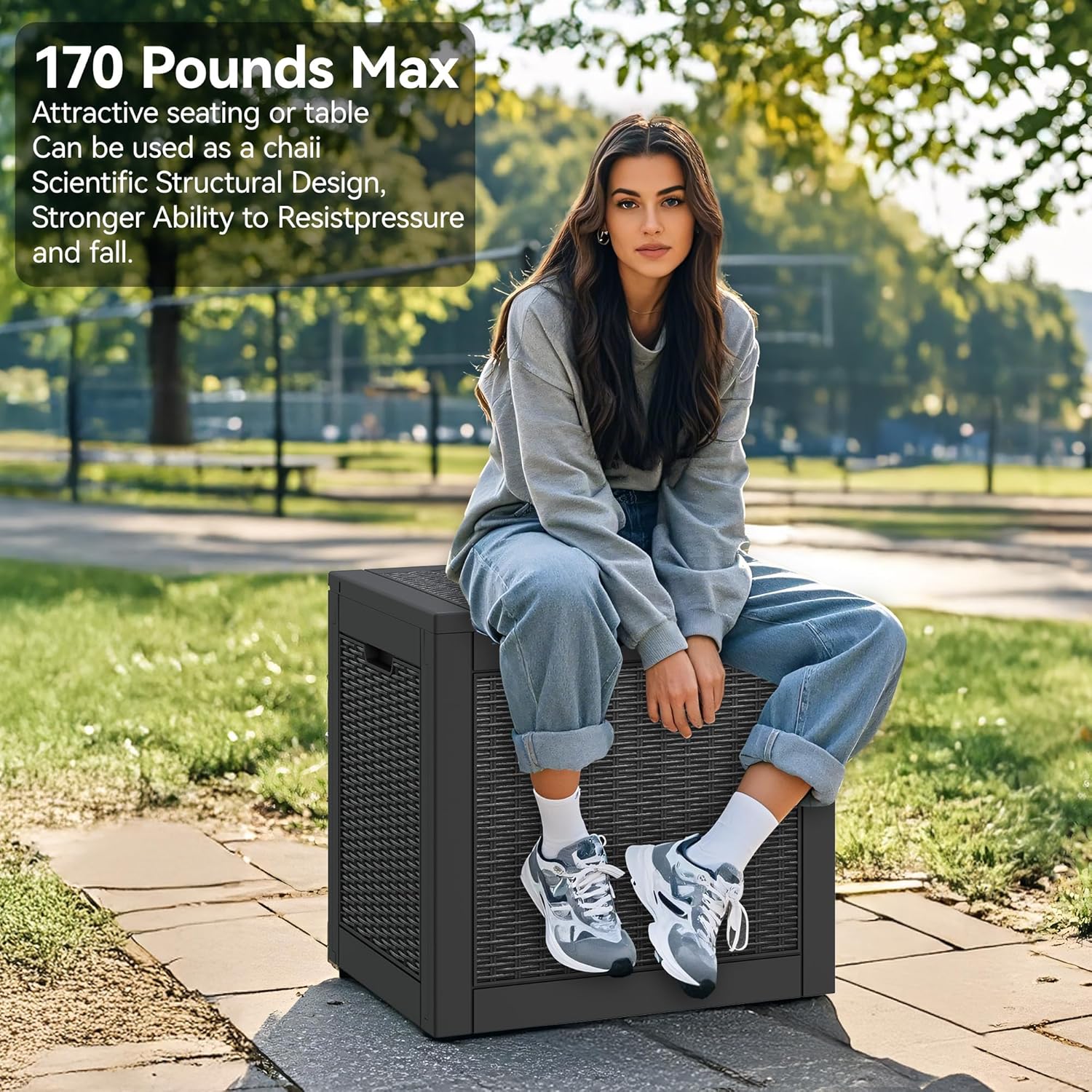 - Immense Storage Capacity: With dimensions of 22.1in x 17.1in x 20.8in, this deck box offers perfect storage space for all your outdoor essentials. It can hold up to 31 gallons of garden tools, pool supplies, patio furniture, cushions, and more.