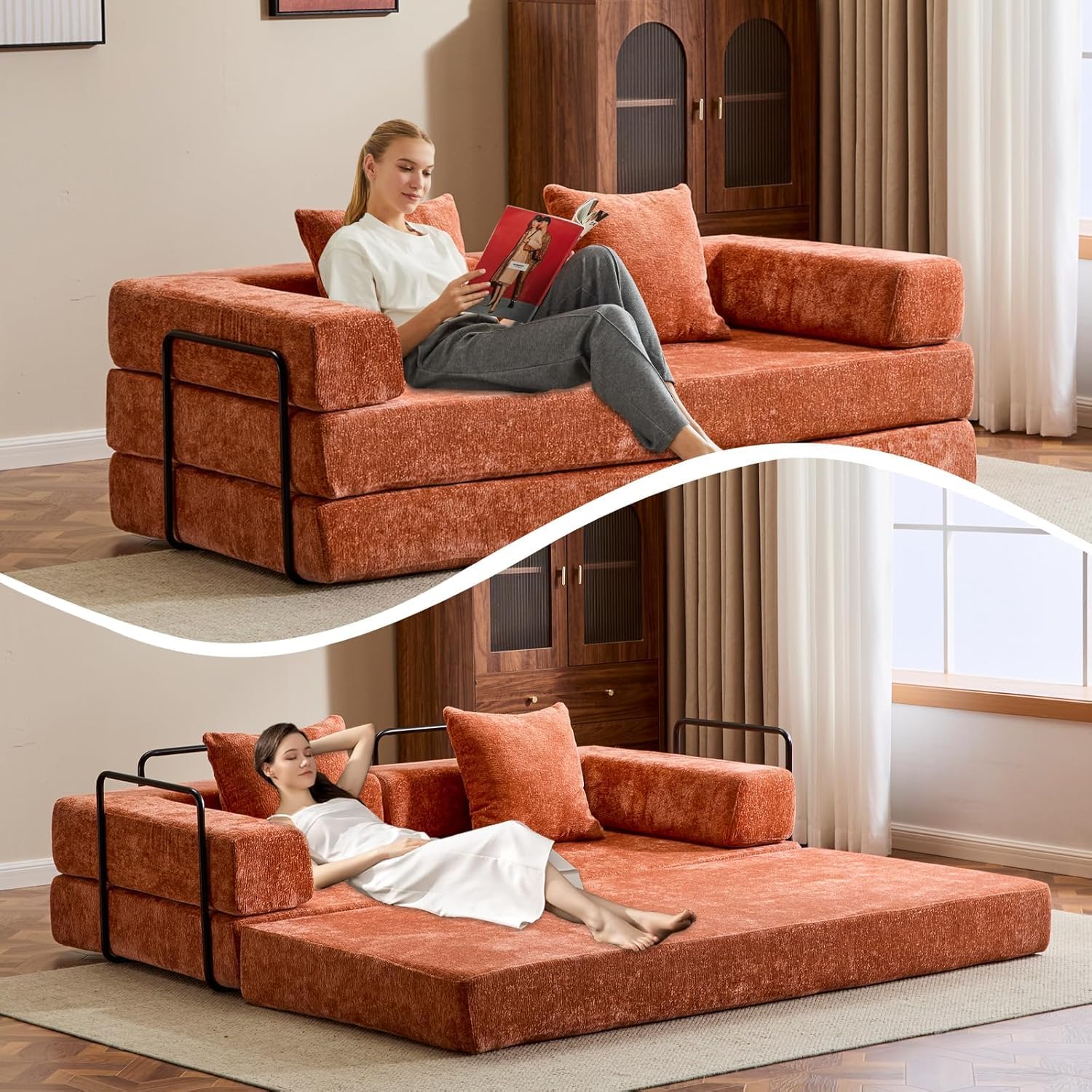 Convertible Sleeper Sofa Bed, Compression Folding Sofa with Pillow, No Assembly Required, Shape Frame, Floor Sofas Lounge Couch for Living Room, Bedroom, Small Spaces (Chenille, 77''W, Orange)
