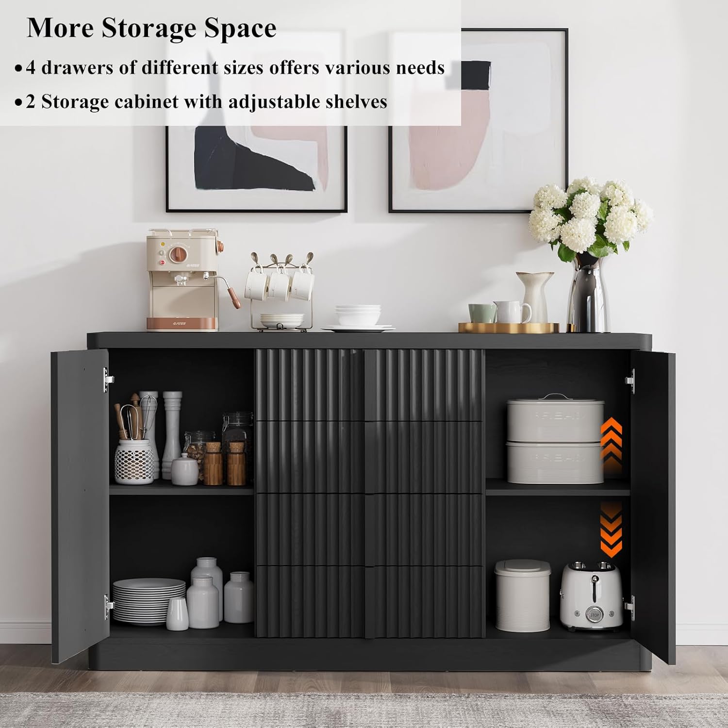 Buffet Cabinet with Storage, 120" Fluted Coffee Bar with 8 Drawers & 4 Doors, Modern Sideboard Buffet with Solid Wood Handle, Credenza Storage Cabinet for Living Room Kitchen Dining Room, Black(2PCS)