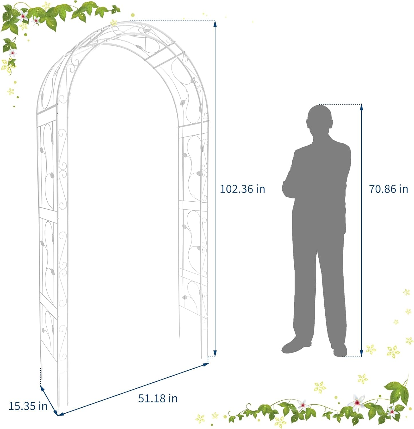 - 【Versatile Outdoor Decor】--Measuring 102.36"H x 51.18"W x 15.35"D, this metal garden trellis arch features an open design, making it perfect for garden entrances, walkways, wedding arch decorations, and outdoor celebrations.