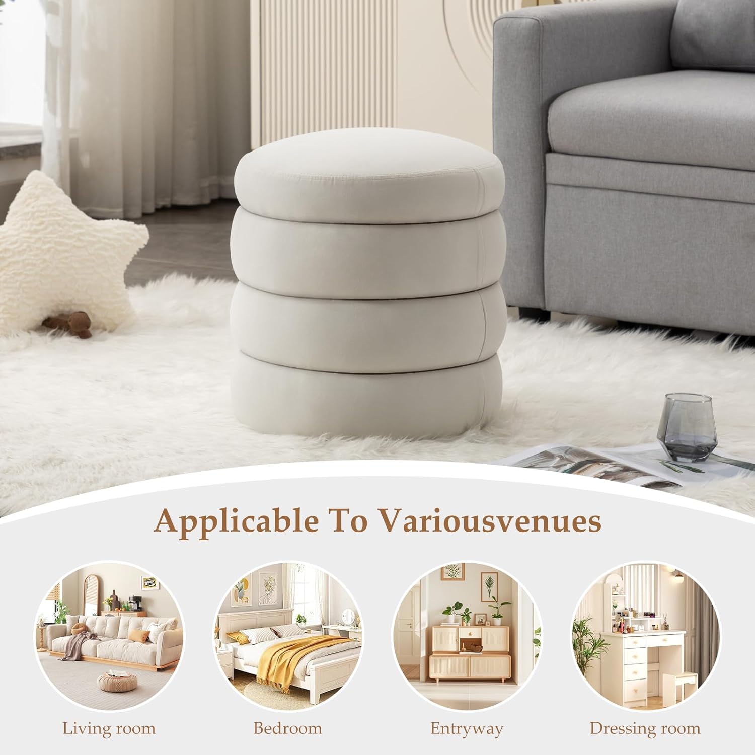 - [Versatile and Practical Footstool] - The storage ottoman round can not only be used to store your extra items, but also can be a footstool ottoman when you watching TV for bedroom, a stool when your friends come to have a coffee with you for living room, a vanity stool when you put on your makeup beside vanity table.
