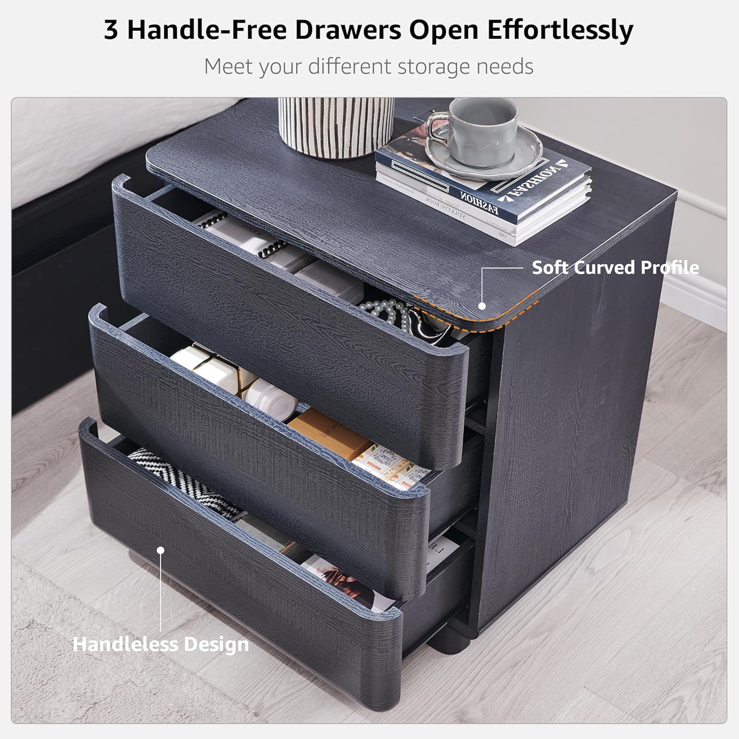 JXQTLINGMU 22" Modern Nightstand Set of 2 with Charging Station, Large Push-to-Open End Table, Wood Bedside Table, Curved Profile, Handleless 3 Drawer Night Stand for Bedroom, Living Room, Black